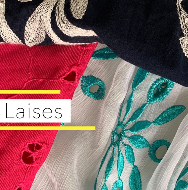 Nós temos uma gama grande de laisse e bordado inglês. Bicolor,ton sur ton, com recortes grandes e pequenos, além de bases diferenciadas.