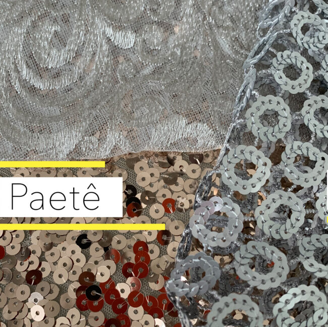 Artigos com paetês diferenciados, texturas e aplicações, desde pedratia até fios metálicos.